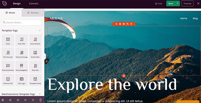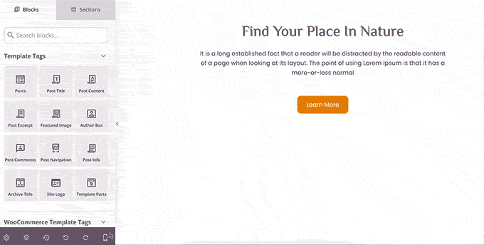 SeedProd's drag-and-drop builder allows you to construct stunning layouts using blocks and sections. On the left, you'll find your design elements, while on the right, you'll see a dynamic, editable live preview of your theme template.