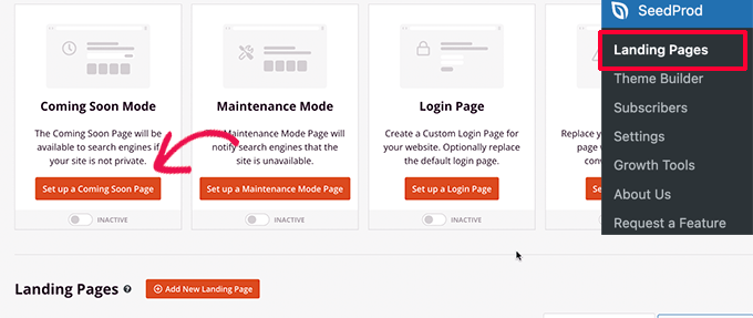 Next, from your WordPress admin area, head to the SeedProd » Landing Pages screen. Here, click the ‘Set up a Coming Soon page’ button.