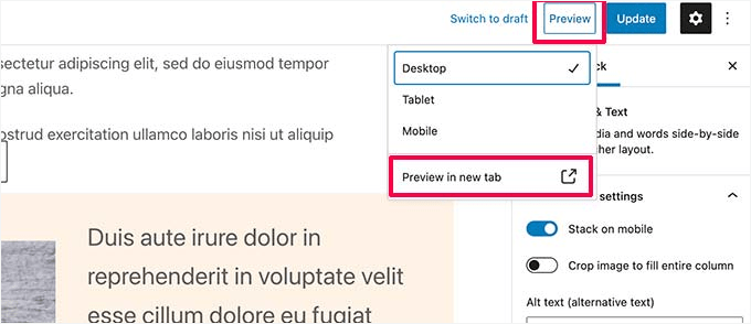 While you can choose between Desktop, Tablet, and Mobile preview options directly within the editor, these only offer an approximate view. To see the actual look and feel on your website, select your desired device, then click the ‘Preview in new tab’ option.