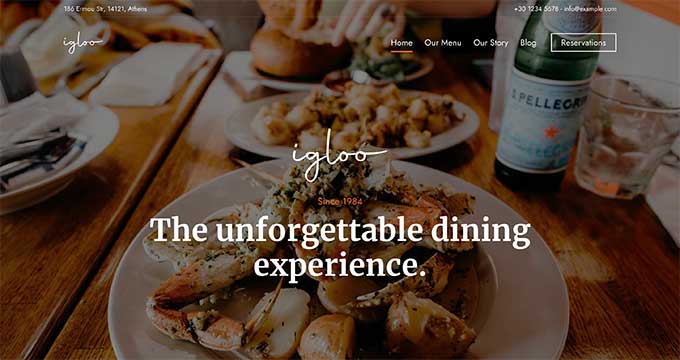 Igloo features large, impactful featured images and a stunning homepage slider with a bold call to action. It also includes dedicated sections for showcasing customer testimonials, creating beautiful galleries, and a prominent contact form, ensuring all key restaurant information is easily accessible.